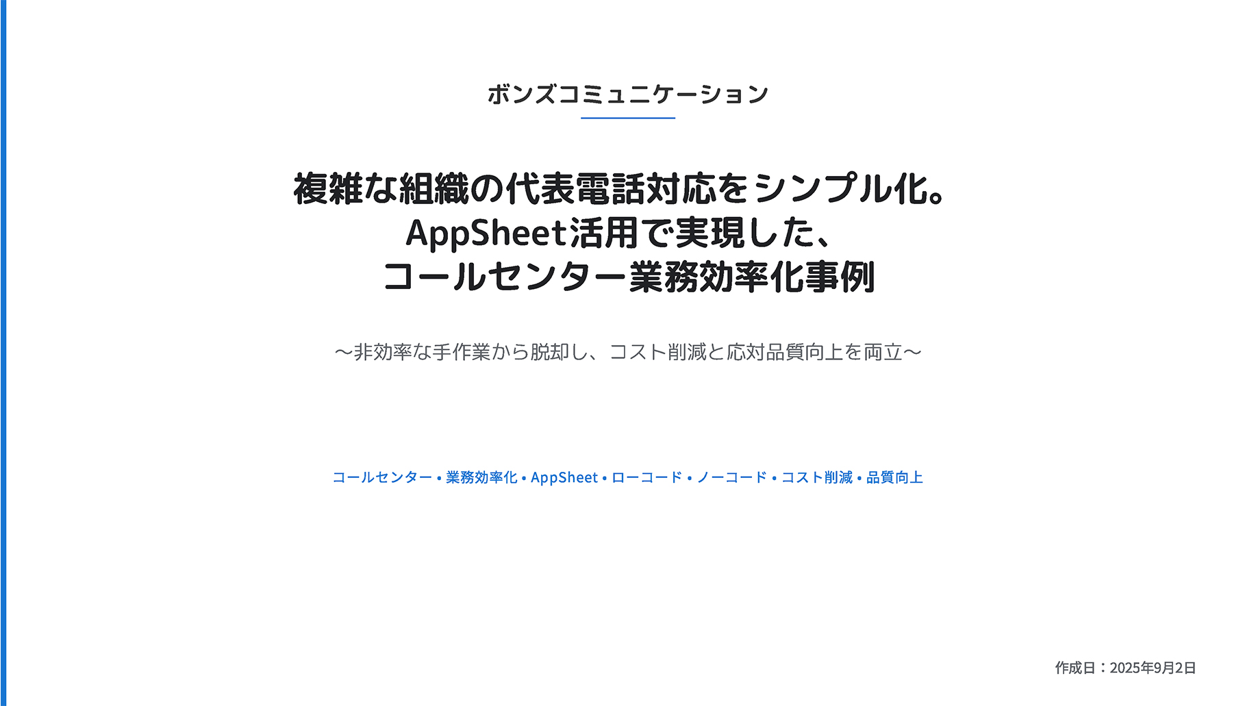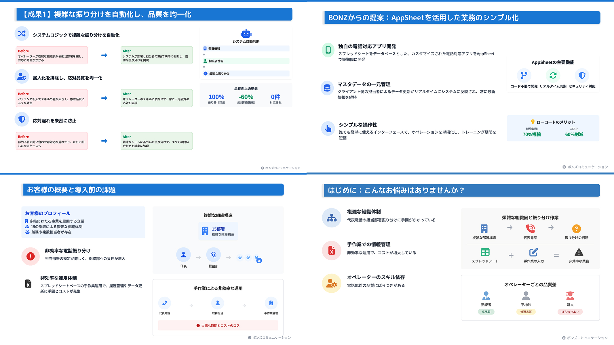 この資料は、複雑な組織の代表電話対応を効率化した事例を紹介しています。
