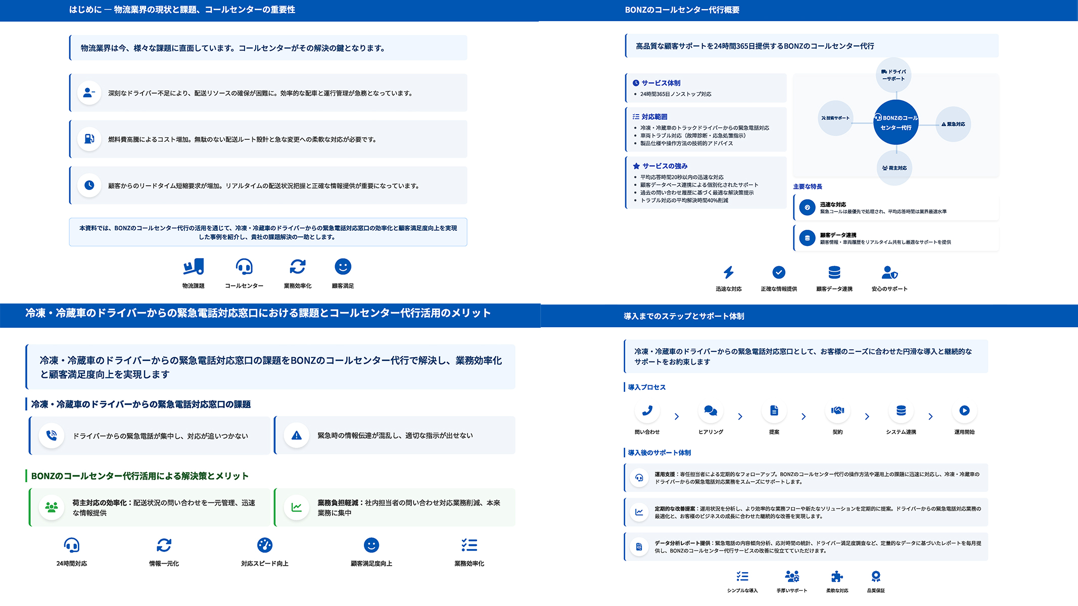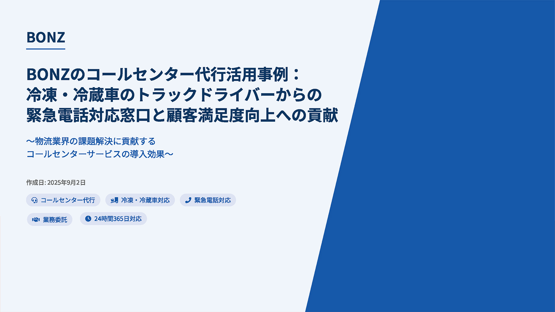 冷凍・冷蔵車のドライバーからの緊急電話対応を切り口に、ボンズのコールセンター代行がどのように解決策を提供しているかをまとめています。
